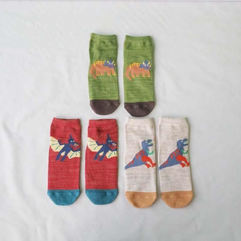 ゆるいタッチで描かれた恐竜柄のくつした3足セット。